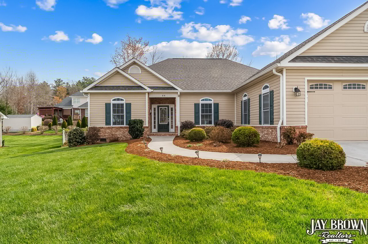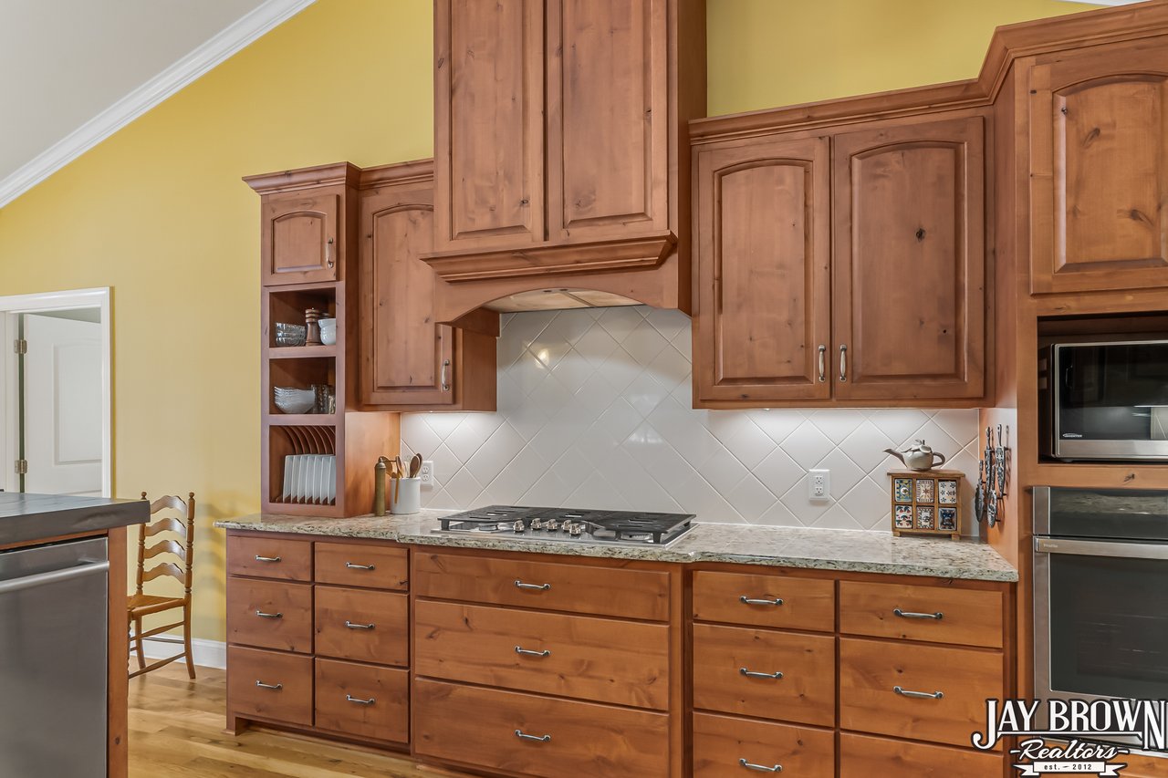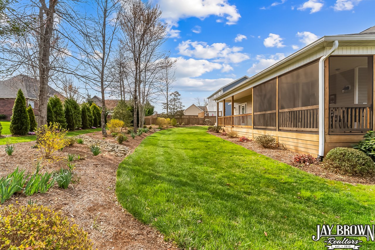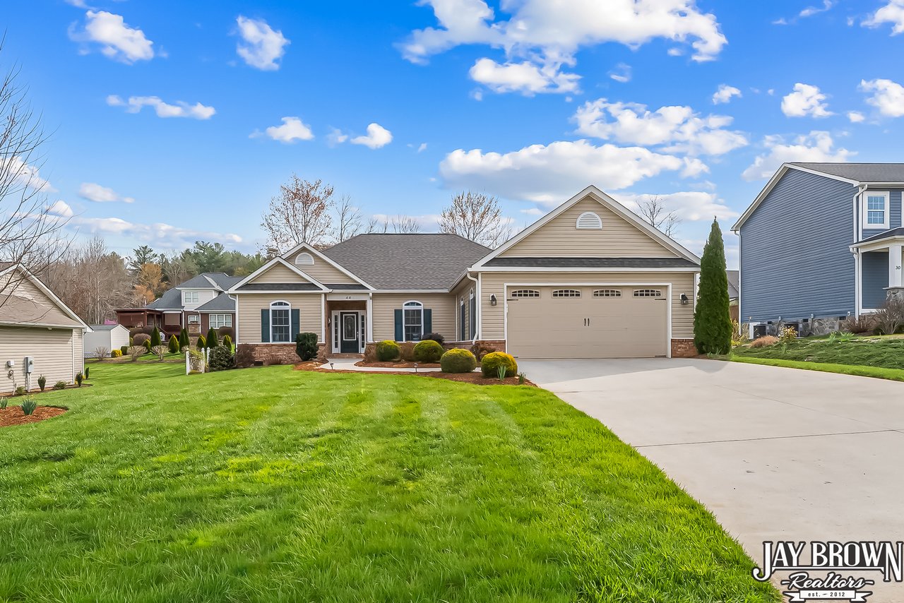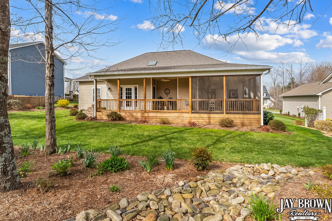 Stunning and immaculately maintained, this custom built 3BR/2BA home was thoughtfully designed and features high end details, one level living and is perfect for aging in place! Gorgeous white oak hardwood floors flow throughout! The spacious kitchen features an incredible amount of cabinet storage space, granite countertops, tile backsplash, bar seating, a gas stove top, large pantry and a raised dishwasher to make loading and unloading easy! Kitchen drawers are self-closing and cabinets are accented with high-end molding and custom dish display inserts. The kitchen overlooks a sun-filled eat-in area, perfect for entertaining. The open floor plan flows into the spacious living room with raised ceilings and natural gas fireplace. Primary bedroom offers hardwood floors and a custom primary bath with large vanity, double sinks, linen storage and oversized walk-in closet. Spacious primary walk-in shower is tiled and features a zero-threshold entry and custom shower bench. Two more bedrooms complete the split bedroom floor plan, along with a second large full bath. The beautiful covered porch can be accessed from two different locations inside and wraps around the back of the home, offering a large screened-in sitting area and open outdoor deck space. Oversized doorways measure 36in, allowing for easy wheelchair access and there are no steps in the home! Tankless water heater, double hung windows, storm water drainage system in the backyard, and the skylight features a rain sensor and remote opening/closing ability. Lawn and flower beds feature an irrigation system. Custom wine bar with wine fridge area. Wonderful location featuring mature landscaping and no HOA dues! Large, level driveway and oversized garage. Located only minutes from grocery stores, shopping, Lake Hickory, Viewmont and Hwy 321!