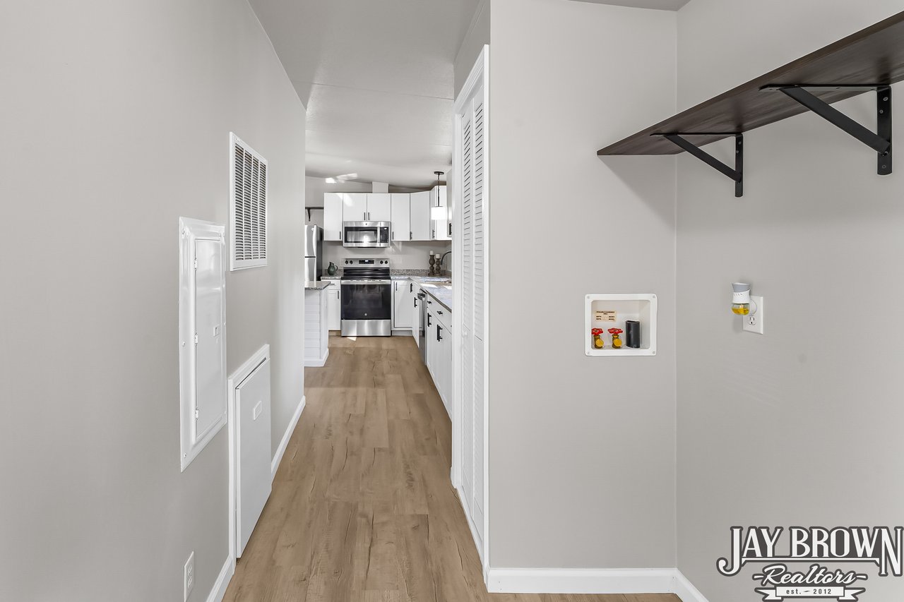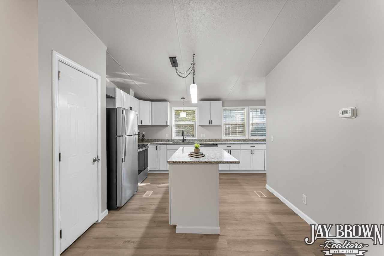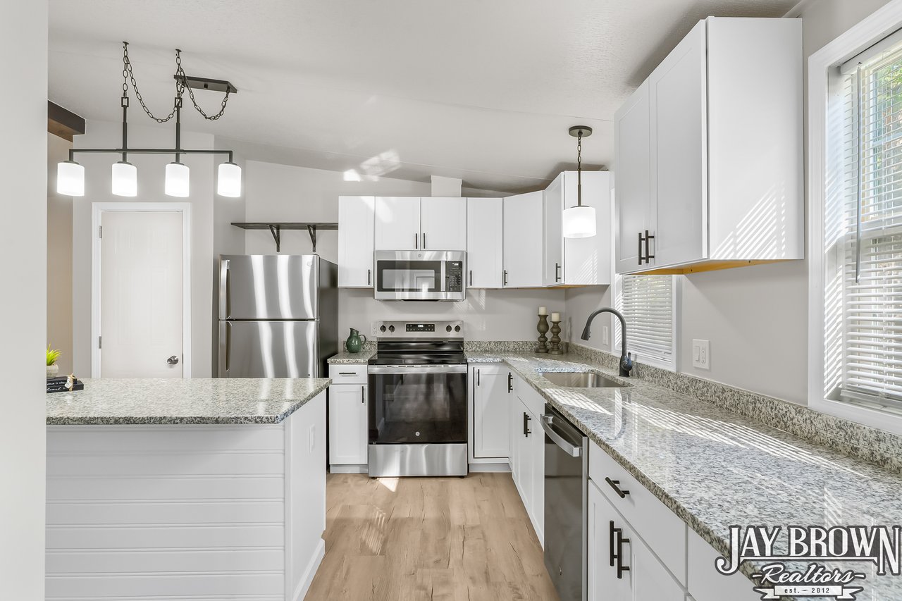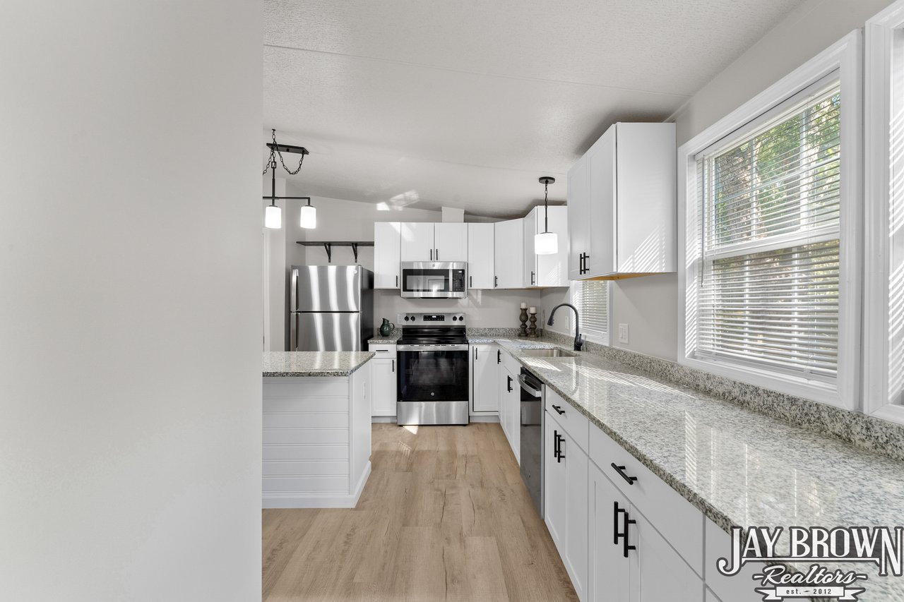 Absolutely beautiful and fully remodeled! This 3BR/2BA home has an open floor plan, beautiful new kitchen and a great location! New roof and new HVAC, both with 10 year transferable warranties! Kitchen has been fully remodeled with beautiful white cabinets, granite countertops, a large island with bar seating, new stainless appliances, pantry, new sink and light fixtures! The kitchen flows into the bright and open living room. New LVP flooring throughout! Primary bedroom features an attached fully remodeled full bathroom, with new tile flooring, new vanity, new shower and new fixtures. Two more bedrooms and a second full bath that has also been fully remodeled! A brand new deck offers a great space to enjoy some outside time. Two driveways for ample parking! Storage shed, a great side yard and rocking chair front porch complete this amazing home! Don't miss your chance on this stunning, fully updated home!